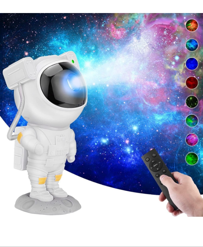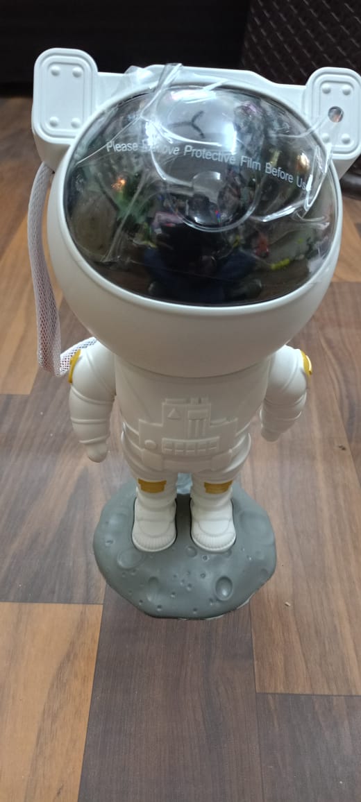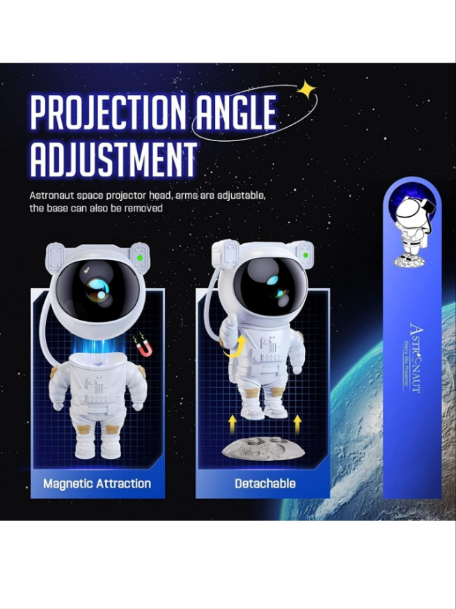 - 360-Degree Rotating Head for Full-Room Projection🪐 – The astronaut’s head rotates a full 360 degrees, allowing the projection to cover every corner of your room. Adjust the direction of the light to focus on walls, ceilings, or create an all-encompassing galactic environment.